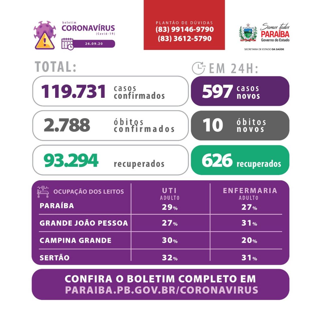 No último sábado (26), a Secretária de Estado da Saúde da Paraíba (SES-PB) registrou, em seu boletim epidemiológico, mais 597 novos casos da Covid-19.