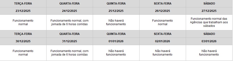 Os Correios terão atendimento hoje (24) por seis horas seguidas e, amanhã (25), as agências estarão fechadas. Nos demais dias, funcionarão como mostra a tabela abaixo: