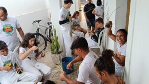 A atividade foi ministrada pelo oficineiro Jonas Gomes, que conduziu o momento com sensibilidade e domínio técnico, repassando aos participantes conhecimentos sobre o manuseio do cipó, a preparação do material e a confecção do caxixi — instrumento ancestral e elemento musical fundamental na prática da capoeira, além de peça artesanal de forte identidade cultural.